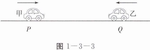 5. 甲、乙两车在平直的路上相向而行,做匀速直线运动,甲速度为 $ 20m/s $ 、乙速度为 $ 15m/s $ ,如图 $ 1 - 3 - 3 $ 所示,当甲车经过 $ P $ 点时,乙车刚好经过 $ Q $ 点,以此刻为计时起点,过了 $ 20s $ 甲、乙两车相距 $ 100m $ ,下列判断错误的是 (
