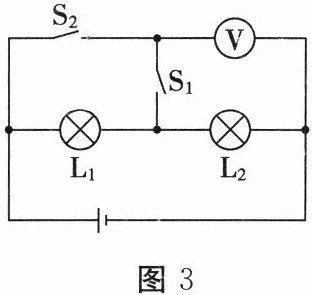 6. 在图 3 所示电路中,电源电压保持不变,当开关 $ S_1 $ 闭合,$ S_2 $ 断开时,电压表的示数是 3 V;当开关 $ S_1 $ 断开,$ S_2 $ 闭合时,电压表的示数是 5 V,则 $ S_2 $ 断开时,灯 $ L_1 $ 和 $ L_2 $ 两端的电压分别为(