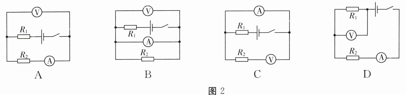5. 在如图 2 所示电路中,电压表测量电阻为 $ R_2 $ 的电阻器两端的电压,且电路连接正确的是(