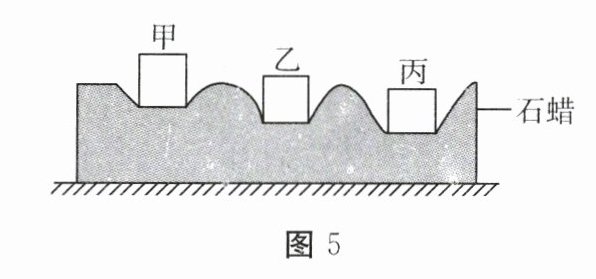 12. 将质量相同、材料不同的三块金属甲、乙、丙浸没在沸水中煮足够长的时间,从沸水中取出金属块放到表面平整的石蜡上,经过一段时间后,观察到如图5所示的现象,比热容最大的金属块是