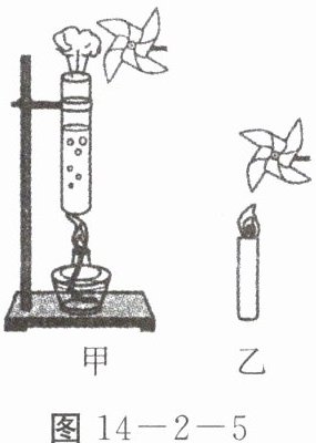 内能转化为机械能 乙 点拨:由题图可知两个实验装置都是热的气体推动风车转动,将内能转化为机械能;题图甲中,是水沸腾时产生的水蒸气推动风车转动,所以是蒸汽机的工作原理图;题图乙中,蜡烛燃烧将化学能转化为内能(使得蜡烛上方的空气温度升高、内能增大),内能再转化为机械能,所以是汽油机的工作原理图。