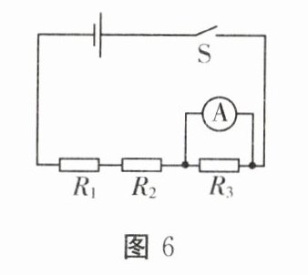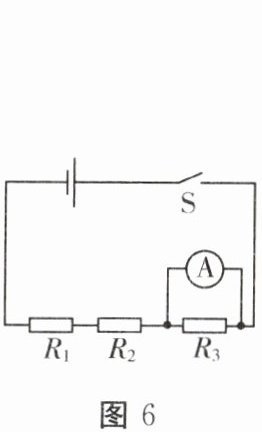 10. 如图6所示,电源电压不变,电阻$R_1= 4Ω,R_2= 6Ω,R_3= 5Ω。$当开关S闭合后,电流表示数为0.3A,则电源电压为