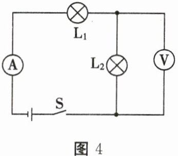 7. 如图4所示,闭合开关$S,L_1$和$L_2$两灯都不亮,电流表指针几乎没有偏转,电压表指针有明显偏转,该电路的故障可能是(