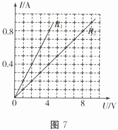 11. 如图7所示是两个电阻器的电流随电压变化的关系图像,由图中信息可推断电阻$R_1$