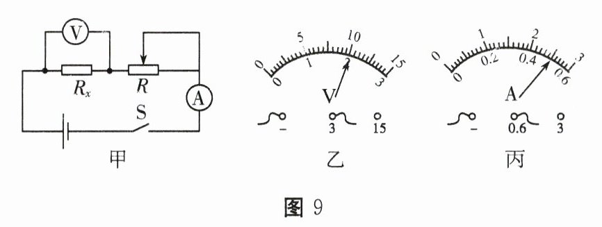 13. 小林按如图9甲所示的电路图连接实验电路,测量待测电阻器的电阻Rₓ。闭合开关S,滑动变阻器滑片滑动到某一位置时,电压表的示数如图9乙所示,电流表的示数如图9丙所示,则电压表的示数为