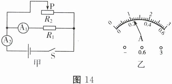(3)若移动滑片P到某位置时,发现一电流表的示数如图14乙所示,求此时电路中的总电阻R。