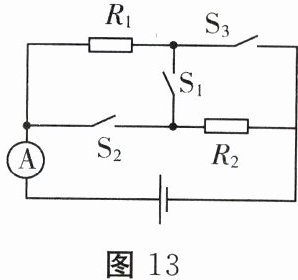 17. (10分)如图13所示的电路中,电阻$R_1$为20Ω,电源电压不变。当$S_1、$$S_2$断开$,S_3$闭合时,电流表的示数为0.45A;当$S_1$断开$,S_2、$$S_3$闭合时,电流表的示数为0.75A。求: