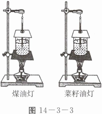6. 小吉学习了燃料的热值后,设计了一个实验来比较煤油和菜籽油的热值的大小关系。他组装了如图$14-3-3$所示的装置进行实验,用装有少量的煤油和菜籽油的两盏灯,分别给两杯温度和质量都相同的水加热。