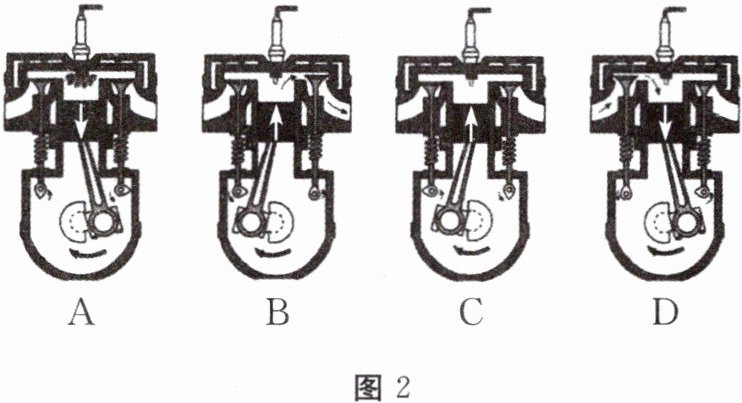5.(临沂)2024年4月20日,我国研制的全球首款本体热效率达53.09%的柴油机正式亮相世界内燃机大会,刷新了柴油机热效率的世界纪录。如图2所示内燃机的四个冲程,气缸内气体的内能最小的是(