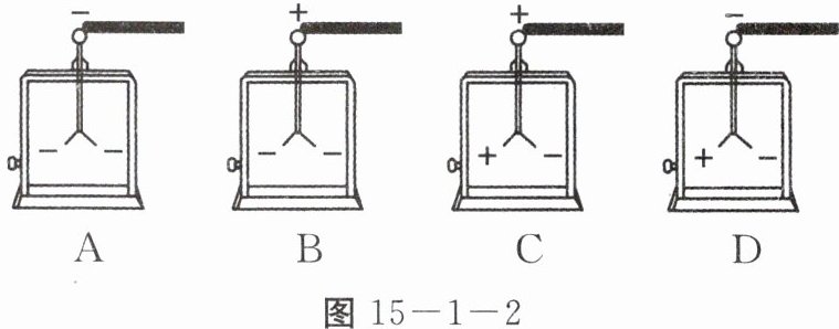 4. 用毛皮摩擦过的橡胶棒接触不带电验电器的金属球,验电器的两片金属箔张开。如图 15 - 1 - 2 所示能正确表示橡胶棒和验电器金属箔带电情况的是(