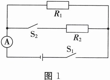 6. 在图 1 所示的电路中,电阻 $R_{1}$ 为 $10\Omega$,只闭合开关 $S_{1}$ 时电流表的示数为 $0.3A$;再闭合开关 $S_{2}$ 后,电流表的示数为 $0.45A$。求: