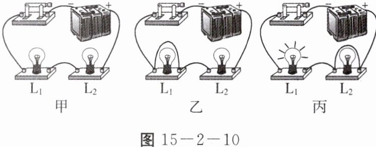 10. 如图 15 - 2 - 10 甲所示电路,闭合开关后$,L_1$和$ L_2$都不亮,现用一根导线检查故障原因。如图 15 - 2 - 10 乙所示,将导线接在$ L_1$两端时$,L_1$和$ L_2$仍然不亮;如图 15 - 2 - 10 丙所示,将导线接在$ L_2$两端时$,L_1$亮$,L_2$不亮。根据上述现象,电路故障应该出现在