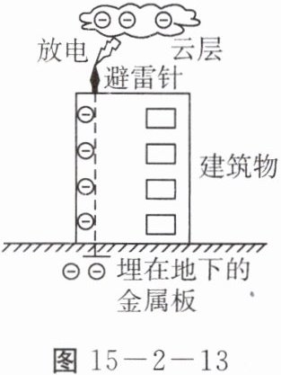 1. 【实际应用】如图 15 - 2 - 13,带负电的云层靠近建筑物上的避雷针时,向避雷针剧烈放电形成雷电,下列说法正确的是(