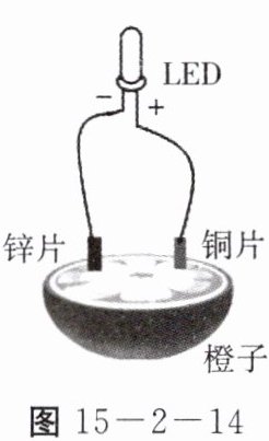 2. 【实验操作】在橙子上插入铜片和锌片,制成水果电池,将水果电池与发光二极管(简称“LED”)连接成如图 15 - 2 - 14 所示的电路,LED 发光。下列说法正确的是(