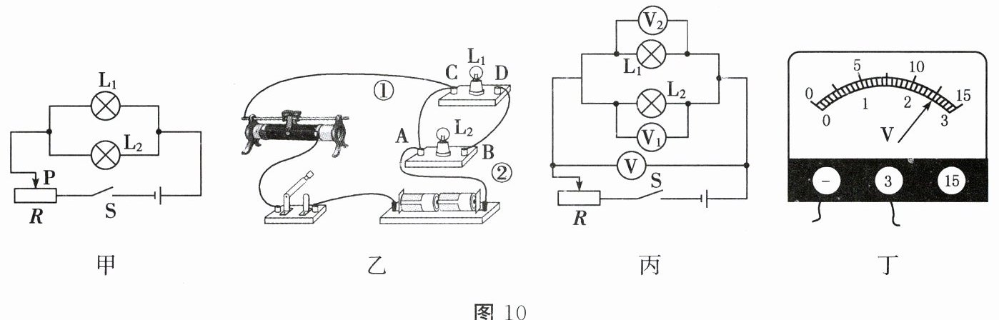 (指出一种即可)。(3)接下来,他们按图丙所示电路图连接了三个电压表,实验过程中,通过调节滑动变阻器使电压表$V_{1}$的示数如图丁所示,则电压表$V$的示数是