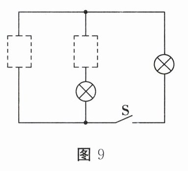 14. (5分)在图9所示虚线框中填入电池和电压表的符号,使电路成为串联电路。