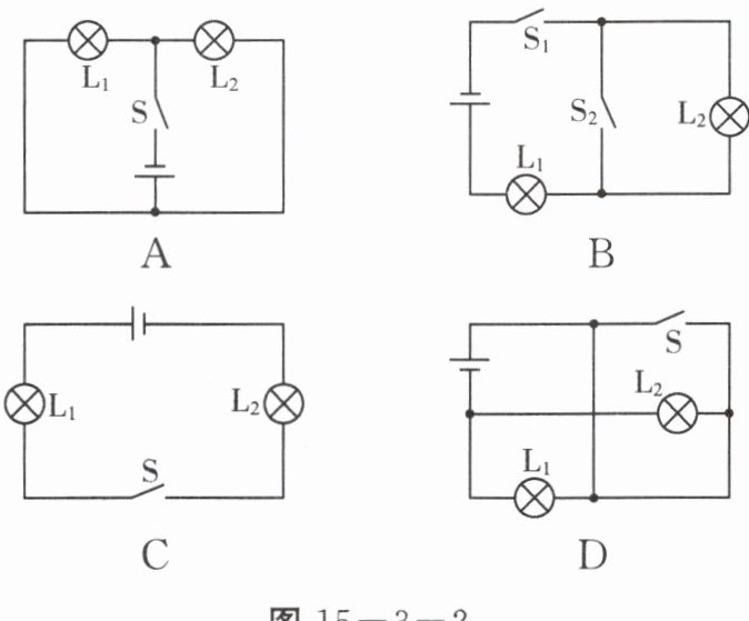 2. 如图 15-3-2 所示的电路图中,开关闭合后,两个灯泡属于串联的是(