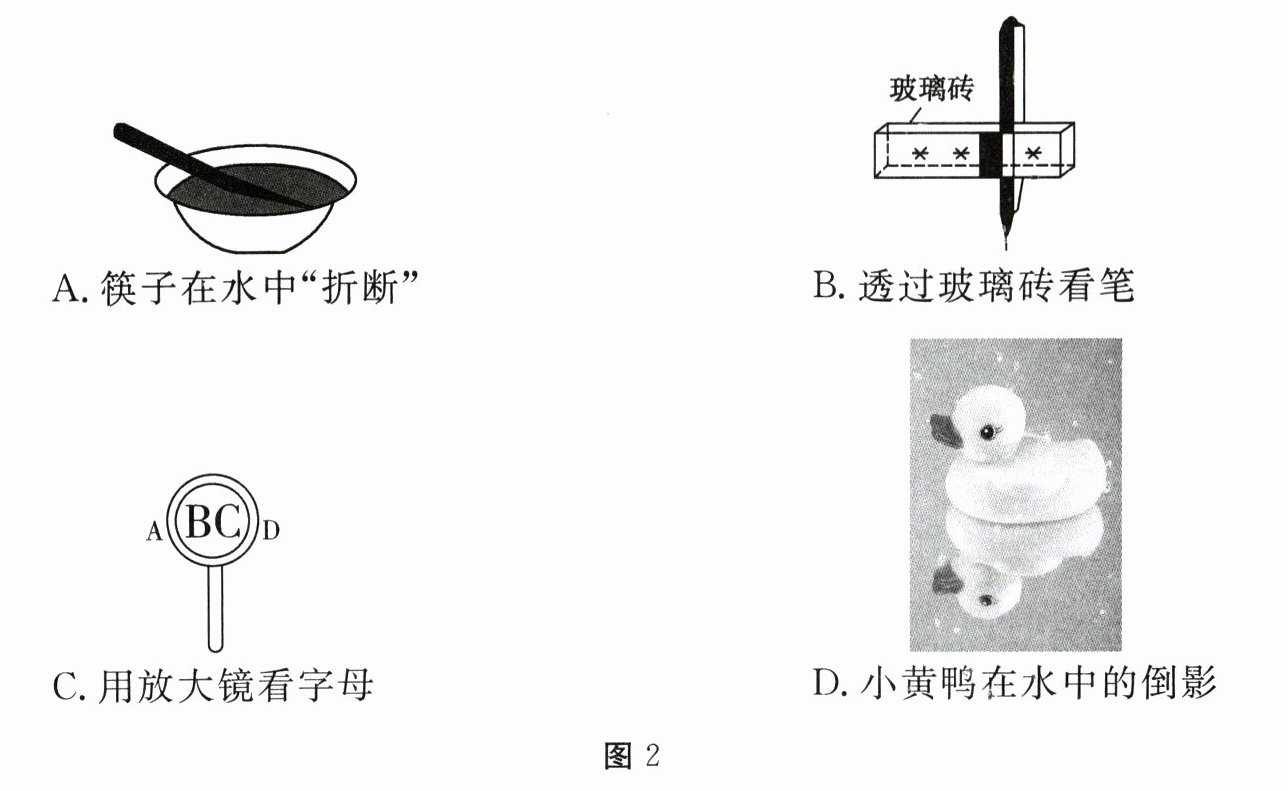 D 点拨:筷子在水中“折断”是由于光从水中进入空气时,发生折射形成的虚像,故A不符合题意;透过玻璃砖看到笔“错位”是由于光经玻璃砖的两次折射所形成的虚像,属于光的折射现象,故B不符合题意;用放大镜把字放大是凸透镜成像,属于光的折射,故C不符合题意;平静的水面相当于平面镜,小黄鸭在水中的倒影是平面镜成像,属于光的反射,故D符合题意。