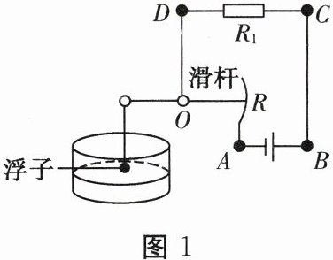2. 如图1所示的装置中,R是滑动变阻器的电阻片。滑动变阻器的滑片跟滑杆连接,滑杆可以绕固定轴O转动,另一端固定一个漂在油面上的浮子。小明想在此装置中接入一块电压表,使油量增加时电压表示数变大,电压表应并联接在图中的(