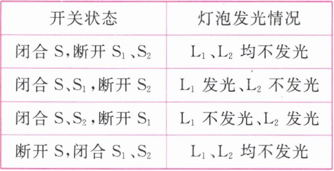 |闭合 S、$S_1,$断开$ S_2$|$L_1 $发光、$L_2 $不发光|