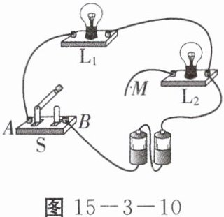 7. 如图 15-3-10 所示,某同学要连接由灯$ L_1 $和灯$ L_2 $组成的并联电路。若开关 S 要同时控制两盏灯,应将导线的 M 端接到图中______点;若开关 S 只控制灯$ L_1,$则导线的 M 端应该接到图中的______点。(均选填“A”或“B”)