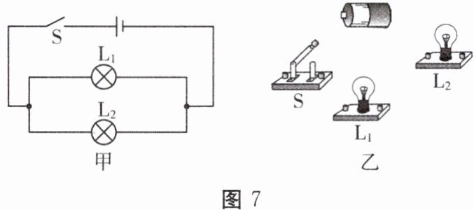 7. 根据如图 7 甲所示的电路图用笔画线表示导线将如图 7 乙所示的实物元件连接起来。