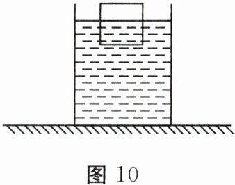 15. 如图10所示,一个圆柱形容器的底面积是$10dm^2,$装入一定量的水,现将一个方木块放入容器中,木块漂浮在水面上,水未溢出,木块浸入水中的体积是$6dm^3,$这时水的深度为8dm(g= 10N/kg,ρ水$= 1.0×10^3kg/m^3)。$求: