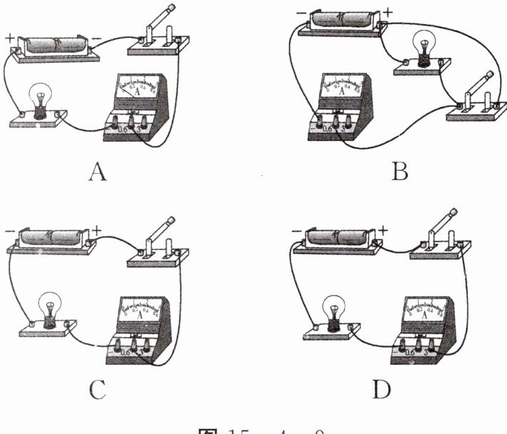 5. 已知一小灯泡单独接在两节干电池的电路中时,通过的电流约为1A,若小林要使用电流表测量小灯泡工作时的电流,如图15-4-9所示的电路中,电流表接法正确的是(