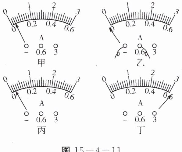 7. 甲、乙、丙、丁四名同学在做“用电流表测电流”的实验中,甲在连接电路前发现指针偏转情况如图15-4-11甲所示,乙、丙、丁闭合开关前,他们的电流表指针均指在零刻度线处,当闭合开关试触时,发现电流表指针摆动分别出现了如图15-4-11乙、丙、丁所示的三种情况。