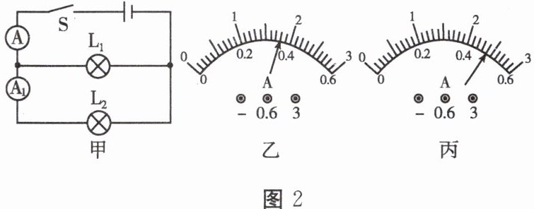 【例 3】 如图 2 甲所示,当开关 S 闭合时,两只电流表 A、$A_1 $的示数分别由图 2 乙、丙两图读得,则灯$ L_1 $中的电流是(
