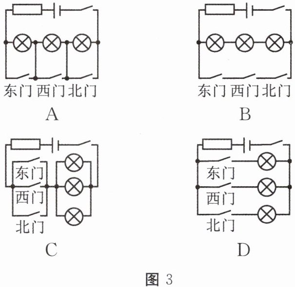 【例 4】 小施学校的教学楼有东、南、西、北四扇大门,放学后要求都要将门关上。平时传达室的蒋师傅住在南门,每天都要跑三个地方检查门是否关上,非常辛苦。小施学了电学知识后,为减轻蒋师傅的工作量,设计了一电路图,即三个门中只要有门没关好(相当于一个开关断开),则代表该扇门的指示灯就会发光。图 3 所示电路图中符合要求的是(