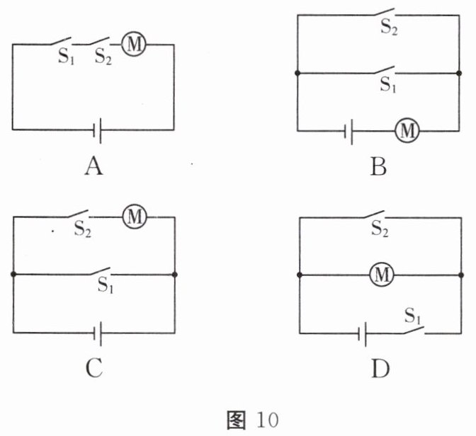 8.(长沙)中国高铁技术世界领先,给人们出行带来极大的便利。乘客进站时,需同时通过身份证验证(相当于闭合$ S_1)$和人脸识别(相当于闭合$ S_2),$方可开启闸机 M。图 10 中电路设计符合要求的是(