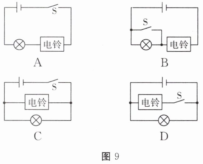 7.(天津)某兴趣小组要为居家老人设计一个“应急呼叫器”电路,要求:开关断开时,电灯和电铃均不工作;开关闭合时,灯亮铃响,即使电灯因断路不亮,电铃仍可工作。如图 9 所示的电路中,符合设计要求的是(