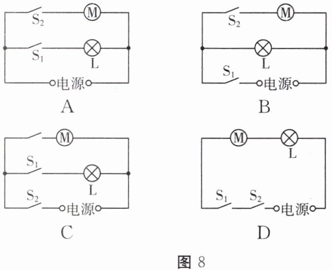 6.(重庆)家用电动窗帘的电路主要由电源指示灯 L 和电动机 M 组成。先闭合开关$ S_1,$电源指示灯 L 亮;再闭合开关$ S_2,$电动机 M 工作拉动窗帘。当$ S_1 $断开时,电动机 M 不能工作。如图 8 所示电路中符合要求的电路是(