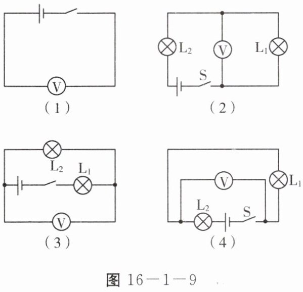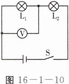 6. 在横线上写出电路图16-1-9中,开关闭合后电压表的测量对象。(均选填“电源电压$”“L_1$两端的电压”或$“L_2$两端的电压”)