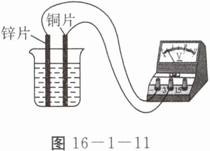1. 【跨学科·化学】在烧杯中加入盐水,将铜片和锌片放在盐水中,这就是一个电池。用电压表测量这个自制电池的电压,其现象如图16-1-11所示。下列说法正确的是(