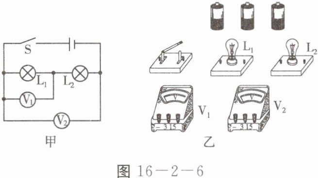 6. 按图 16-2-6 甲所示的电路图,用笔画线代替导线将图 16-2-6 乙的实物连接起来,要求导线不交叉。(已知 $L_1$ 两端的电压为 $1.6$ V,$L_2$ 两端的电压为 $2.8$ V)