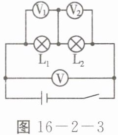 3. 如图 16-2-3 所示电路,闭合开关后,$V_1$、$V_2$ 和 $V$ 三个电压表的示数分别是 $U_1$、$U_2$、$U$,已知 $U = 4.5$ V,$U_1 = 2.2$ V,则 $U_2$ 的大小为(
