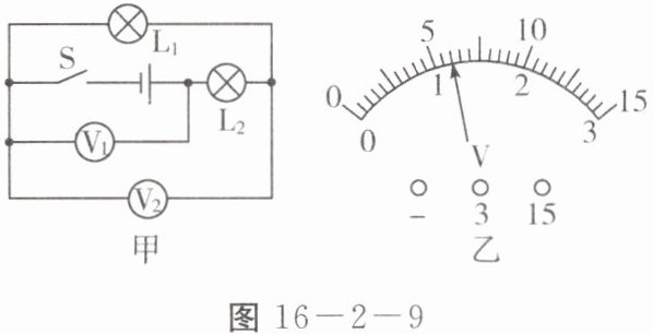 3. 如图 16-2-9 甲所示的电路中,当闭合开关 $S$ 后,两个电压表指针偏转均如图 16-2-9 乙所示,则灯 $L_1$ 和 $L_2$ 两端的电压分别为(