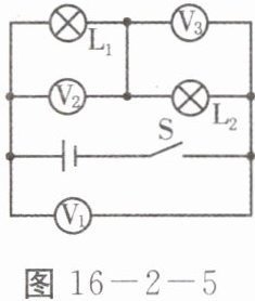 5. 如图 16-2-5 所示的电路中,闭合开关 $S$,电压表 $V_1$、$V_2$ 和 $V_3$ 分别测量的是