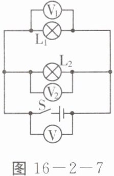 1. 如图 16-2-7 所示,开关 $S$ 闭合后,灯泡 $L_1$ 比 $L_2$ 亮,电压表 $V_2$ 的示数为 $6$ V。下列说法正确的是(