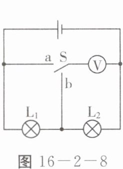 2. 如图 16-2-8 所示的电路图,开关 $S$ 接到 $a$ 时电压表的示数为 $8$ V,开关 $S$ 接到 $b$ 时电压表的示数为 $3$ V,下列说法不正确的是(