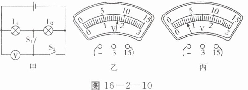 4. 如图 16-2-10 甲所示,电源电压恒定。当开关 $S_1$ 断开、$S_2$ 闭合时,电压表的示数如图 16-2-10 乙所示;当开关 $S_1$ 闭合、$S_2$ 断开时,电压表的示数如图 16-2-10 丙所示,则灯泡 $L_1$,$L_2$ 两端的电压分别为(