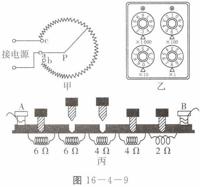 } Ω;$如图 16 - 4 - 9 丙所示是插入式电阻箱的结构示意图,则此时 A、B 两个接线柱之间的电阻是$ \underline{ 10