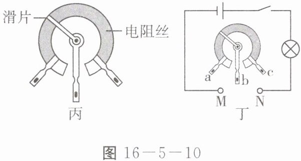 (2)学习完“练习使用滑动变阻器”后,小吉同学从网上买了一个合适规格的电位器,准备制作一盏简易的调光台灯。如图 16 - 5 - 10 丁所示,若要使旋钮顺时针转动时台灯变亮,则应将电位器的