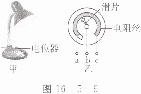 1. 【实际应用】如图 16 - 5 - 9 甲所示为某可调节亮度的台灯,图 16 - 5 - 9 乙为其用于调光的电位器结构图。$ a $、$ b $、$ c $ 是它的三个接线柱,$ a $、$ c $ 分别与弧形电阻丝的两端相连,$ b $ 与金属滑片相连,转动旋钮,滑片在弧形电阻丝上滑动即可调节灯泡亮度。下列分析正确的是(