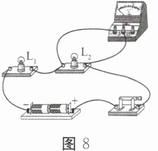 6.(深圳)在物理实验操作考核中,小明把两灯串联,闭合开关后,发现 $ L_1 $ 亮,$ L_2 $ 不亮。为了找出原因,他把电压表并联在 $ L_2 $ 两端,如图 8 所示,发现电压表示数为零,则原因可能是(
