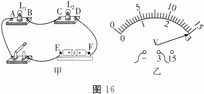 (2)正确安装后,闭合开关,两灯均不发光,小明用电压表试接 A、B 接线柱,发现指针偏转情况如图 16 乙所示,则可判断