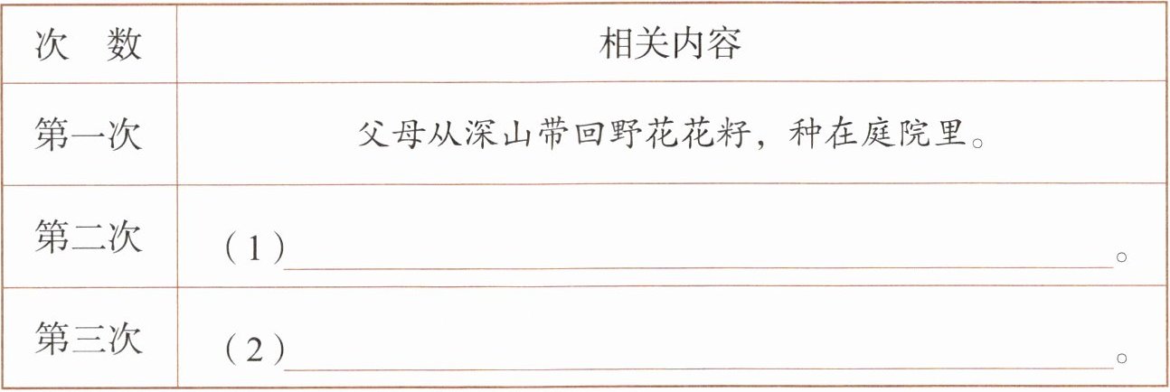 11. 文章写了三次花籽的传递,结合全文,将下面表格填写完整。(6分)