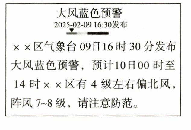5. 小宇通过手机看到这样一则信息(如图)。他通过网络搜索知道了$7级风的风速为每秒13.9~17.1\ m$,称为“疾风”;$8级风的风速为每秒17.2~20.7\ m$,称为“大风”。$7$级风的风速最慢约是每小时多少千米?(得数保留整数)